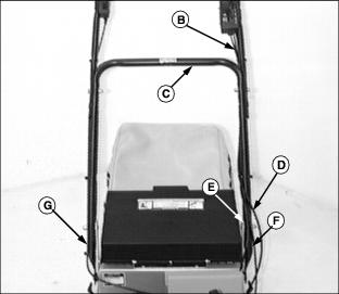 AssemblyFasten Lower Handle to Bracket1. Put four-hole bracket (arrow) inside handle on each side. 2. Install M8 x 40 round-head bolt (A) through desired square hole in bracket and through the handle on each side. Use same square hole on each side. 3. Install lock nut on each bolt. Fasten Upper Handle to Lower Handle1. Pivot upper handle to the straight position. 2. Hold handle and install M8 x 40 hex-head bolt and lock nut (A) on each side. · Cables (B) must be under cross bar (C). · Cables (D) must be on top of handle and outside bracket (E). 4. Install tie strap (F) through hole in handle, then around handle and two cables. 5. Install tie strap (G) through hole in handle, around cable and lower half of handle. Add Engine Oil