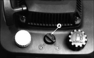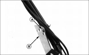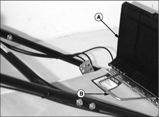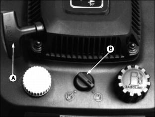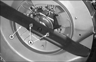 3. Turn mower on its right side. 4. Remove bolts (A) and blade (B). 5. Install blade with wings pointing upward. 6. Tighten bolts to 75 N·m (55 lb-ft). Transporting MowerTurn the fuel shutoff knob to the closed position when transporting the mower to prevent fuel from flowing into the engine. |