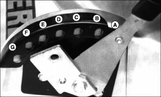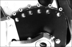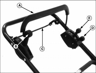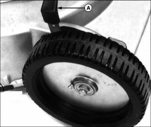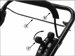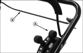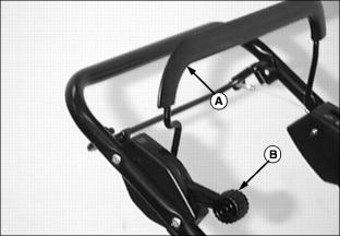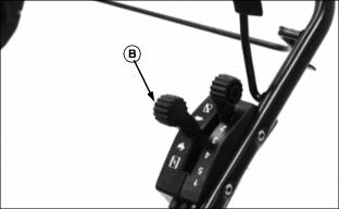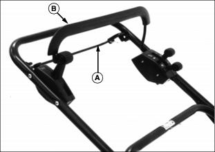 OperatingDaily Operating Checklisto Remove grass and debris from machine. o Check area below machine for leaks. Avoid Damage to Plastic and Painted Surfaces· Do not wipe plastic parts unless rinsed first. · Insect repellent spray may damage plastic and painted surfaces. Do not spray insect repellent near machine. · Be careful not to spill fuel on machine. Fuel may damage surface. Wipe up spilled fuel immediately. Handle ControlsEngine ControlsCutting Height ControlsAdjusting Cutting HeightNOTE: Adjust both levers to same height except for two lowest cutting heights (A and B on following chart). At two lowest cutting heights, raise rear lever one notch higher than front lever. This adjustment allows for increased air flow when bagging and side discharging, and provides a larger exit window for clippings when mulching. Begin at upper cutting height, then adjust downward as desired, to avoid scalping lawn with too low a setting. Highest cutting height for rear wheel is lever in furthest front position. Highest cutting height for front wheel is lever in furthest back position. Picture Note: Left front wheel lever shown Picture Note: Left front wheel lever shown To help adjust rear wheel levers:1. Lift lower handlebar slightly with one hand to take some weight off wheel. 2. Move height adjustment lever to desired position with other hand. Adjusting Handle Height1. Remove bolt (A) and lock nut from each side of handle. 2. Install bolt in desired hole in bracket (B) and through holes in handle. Testing Safety SystemsUse the following checkout procedure to check for normal operation of machine. If there is a malfunction during one of these procedures, do not operate machine. See your John Deere dealer for service. Perform these tests in a clear open area. Keep bystanders away. Testing Blade Control Lever3. Release blade control lever. 4. Listen for blade to stop. Do not look under mower to check blade.
