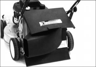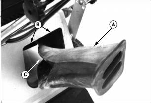 1. Turn fuel shutoff knob (A) to the open position. COLD ENGINE: Push lever forward to choke position. WARM ENGINE: Push lever forward to fast position. 3. Put your foot on foot pad located on top, left side of deck. 4. Pull starter handle until you feel resistance. Then pull fast and steady until engine starts. 6. Pull back throttle lever to half-throttle position. 7. Mow with throttle lever in fast position. Blade OperationNOTE: Do not engage blade in heavy grass or engine may stop. To Engage Blade2. Pull and hold blade control lever (A) against handle. 3. Push blade engagement lever (B) forward until it latches. To Disengage BladeRelease blade control lever (A). Forward TravelTo Travel ForwardPull and hold traction clutch lever (A) against handle (B). To Stop Forward TravelRelease lever (A). Release lever before you turn. NOTE: Rear wheels should make a clicking noise when you push mower forward. This means drive train is operating correctly. Travel Speeds· 1st Gear: 1.9 km/h (1.2 mph) · 2nd Gear: 2.9 km/h (1.8 mph) · 3rd Gear: 3.9 km/h (2.4 mph) · 4th Gear: 4.8 km/h (3.0 mph) · 5th Gear: 6.6 km/h (4.1 mph) To Change Travel Speed:2. Move gear lever (A) to desired position. 3. Engage traction clutch lever (B). Stopping Engine1. Release traction clutch lever (A). 2. Release blade control lever (B). 3. Pull throttle lever (C) back to stop position. 4. Turn fuel shutoff knob to closed position when you are done mowing. Emergency StoppingUsing Discharge Chute (Optional)1. Stop engine. Lift and hold door. 3. Install chute. Lower door to hold chute in place. Using Grass Bag2. Grasp handle (B). Lift bag on or off mower. NOTE: Bag may wear and deteriorate. Check condition of bag often. Use a John Deere bag or equivalent to comply with safety specifications. Using Mulch Plug (Optional)See your John Deere dealer for Mulch Plug. Mulch blade is standard equipment on the mower and works equally well with mulch plug, chute, or bag. You do not need to change the blade when you change attachment. 3. Install plug (A) in opening (B) with (C) facing left. 4. Push and turn plug counterclockwise until it is seated. Using High Lift Blade (Optional)High lift blade is recommended for the most favorable bagging performance. See your John Deere dealer for high lift blades. 1. Disconnect spark plug wire. 2. Turn fuel shutoff knob to closed position.
