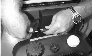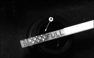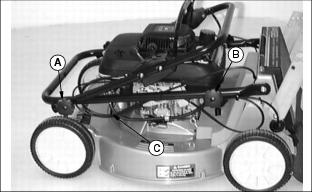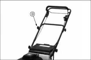 AssemblyRemove Handle Hardware1. Loosen knob (A) on each side. 2. Remove knob (B) and bolt from each side. 3. Cables (C) should be inside handle. Unfold Handles1. Remove tie strap from around blade lockout lever and handle. 2. Remove foam packing from lower handlebar. 3. Install bolt (A) through desired square hole in bracket (B) and through handle on each side. Bracket should be inside handle. Use same square hole on each side. 4. Install knob (C) on each bolt. 5. Pivot handle to the STRAIGHT position. Hold handle and tighten knob (D) on each side. Add Engine Oil2. Pour 0.6 L (20 oz) oil into dipstick tube. · Check oil level. Oil should be to the FULL mark (A). If not, add Oil. 5. Install and tighten dipstick. 6. Remove "NO OIL" tag from top of engine. Charge Battery (JE75)