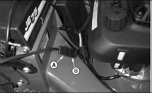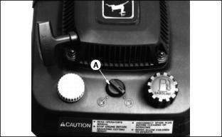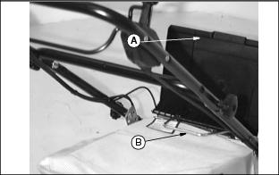 1. Disconnect battery wire connector from engine wire connector. 2. Connect battery charger cord connector (A) to battery wire connector (B). 3. Plug battery charger into a 115-volt house receptacle. 4. Charge battery 24-36 hours. 5. Unplug cord from house receptacle, then from battery. 6. Connect battery wire connector to engine wire connector. Install Grass BagTest Mower1. Put enough fuel in fuel tank to test mower operation. 2. Turn fuel shutoff knob (A) to the OPEN position. 3. Move throttle lever (B) to the FAST r position. 4. Start engine and check mower operation. (See Operating section). 5. Stop engine and turn fuel shutoff knob to the CLOSED position. |