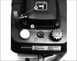 ControlsEngine ControlsA - Starter Handle - Pull to start engine B - Fuel Shutoff Knob - Controls fuel flow to engine Handle ControlsA - Blade Lockout and Stop Lever - Stops blades B - Traction Clutch Lever - Engages traction C - Key (Model JE75) - Starts engine D - Blade Engagement Lever - Starts blades E - Gear Shift Lever - Changes gears F - Throttle Lever - Controls engine speed Handle and Cutting Height ControlsA - Fold Handle Knobs - Folds handle |