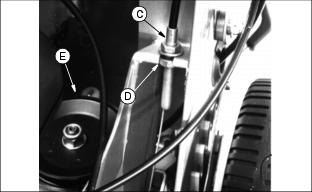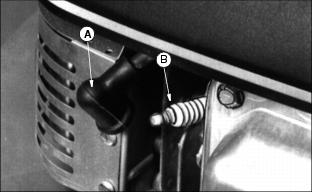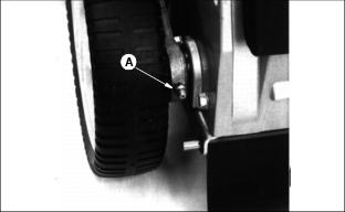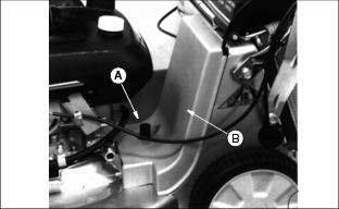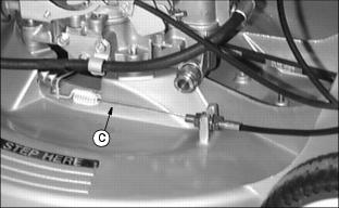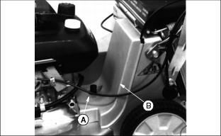 Adjust clutch before 50 hours if mower slows as it goes uphill. 1. Remove knob (A) and shield(B). 3. Turn nut (D) down 6 mm (1/4 in.). 6. ENGAGE traction clutch lever to check clutch action. 7. If clutch needs more tension, repeat Steps 2 and 3. 8. Make sure pulley (E) does not turn when engine is running and clutch lever is DISENGAGED. If pulley turns when engine is running, traction clutch cable is adjusted too tight. Adjusting Blade Brake ClutchNOTE: Blade should stop within three seconds after you release blade stop lever. If not, adjust clutch. 1. Put blade engagement lever on handlebar all the way to the rear. · Pull threaded fitting to rear to remove all cable slack. · Turn nut (B) against deck fork. · Make sure there is tension on cable (C), but that it is not too loose or too tight. This will give maximum blade brake clutch engagement. GreaseUse grease based on the expected air temperature range during the service interval. The following greases are preferred: · John Deere Moly High Temperature EP Grease. · John Deere High Temperature EP Grease. Other greases may be used are: · SAE Multipurpose EP Grease with 3 to 5 percent molybdenum disulfide. · Greases meeting Military Specification MIL-G-10924C may be used as arctic grease. Lubricate Rear Axle BearingsNOTE: Adjust mower height indicator until zerk is easy to get grease gun on. 1. Wipe grease fittings clean. 2. Lubricate bearing (A) on each side with one shot of John Deere Multipurpose Grease or an equivalent. Cleaning MowerClean engine and top of the deck. Check and clean cooling fins, if necessary. Grass clippings can build up in belt and transmission area. If necessary, remove belt shield and clean this area. DO NOT spray the transmission with water. (See Clean Belt and Transmission Area in this section.) If you operate the mower in dusty conditions, clean air cleaner foam element. Remove mulch plug. Spray under the deck with water under pressure to remove corrosive lawn chemicals and grass buildup. DO NOT spray the transmission with water. (See IMPORTANT information.) Remove and shake bag to remove clippings. If bag is caked with grass on the inside, use water under pressure to clean bag. Direct water from outside to inside of bag. Clean grass clippings that may build up between the wheels and the mower deck. Cleaning Fuel Cap Vent2. Remove rubber vent (B) from cap. 3. Clean cap and vent in an nonflammable solvent. Cleaning Belt and Transmission Area1. Remove knob (A) and shield (B). 2. Remove clippings from belt area and top of the transmission. Servicing Mower Blade
