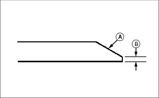 2. Tighten bolts (B) to 75 N·m Sharpening BladeSharpen blade with grinder, hand file, or electric blade sharpener. Keep original bevel (A) when you sharpen. Blade should have 0.40 mm (1/64 in.) cutting edge (B). Balance Blade2. Put blade on a nail in vise or on a vertical wall stud. Turn blade to horizontal position. 3. If blade is not balanced, the heavy end of blade will drop. 4. Grind bevel of heavy end. Do not change bevel. (See Sharpening Blades in this section.) Charging the Battery (JE75)