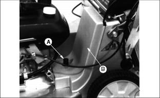 NOTE: If battery is not used for an extended time, you may have to charge it. NOTE: The battery can be charged by running the engine or by using the battery charger. 1. Disconnect battery wire connector (A) from engine wire connector (B). 2. Connect battery charger cord connector (C) to battery wire connector (A). 3. Plug charger into a 115-volt house receptacle. For a new or discharged battery: Charge battery 24-36 hours. 4. Unplug cord from house receptacle, then from battery. 5. Connect battery wire connector to engine wire connector. Removing the Battery (JE75)NOTE: If battery becomes permanently damaged, it can be removed and replaced. NOTE: If the battery is not used for an extended time, you may need to charge it. (See Charging the Battery in this section). 1. Remove knob (A) and shield (B). 2. Disconnect battery wire connector from engine wire connector. 3. Using a 10 mm wrench, loosen lock nut (C) and rotate battery retainer (D) away from the battery. Fuel
