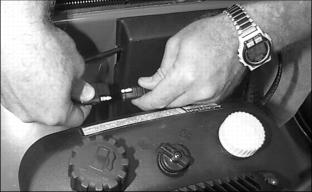 1. Install drain hose (included with mower) on oil drain fitting. 2. Turn fitting to the left to open drain. Drain oil into a container. 3. Tighten fitting. Remove hose. 4. Pour 0.6 L (20 oz) oil into dipstick tube. 5. Install dipstick. DO NOT TIGHTEN IT: LET THREADS REST ON TOP OF TUBE. 6. Check oil level. If necessary, add oil to bring level to the FULL MARK. 7. Install and tighten dipstick. Changing Oil Filter (Optional)