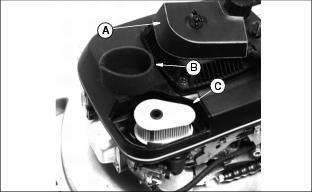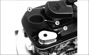 2. Remove filter by turning it to the left. 3. Apply a film of clean engine oil to new filter gasket. 4. Install filter by turning filter to the right until gasket contacts filter base. Tighten filter by hand 3/4 turn more. 5. Pour new oil into dipstick tube. 6. Run engine and check for leaks around filter. 7. STOP engine. Check oil level. 8. Install and tighten dipstick. Cleaning Air Cleaner Foam Element1. Clean cover and area around it. Remove cover (A). 2. Remove foam element (B) from paper element (C). 3. Wash foam element in non-flammable solvent or warm water-detergent solution. 5. Put 10-15 drops of clean engine oil on element. Squeeze element to distribute oil. 6. Inspect paper element. Install elements and cover. Replacing Paper Element1. Clean cover and area around it. Remove cover (A). 2. Remove foam element (B) from paper element (C). · With a break, hole, or damaged seal. · If engine performance is poor. Cleaning and Gapping Spark Plug1. Disconnect spark plug wire (A). Remove plug (B). 2. Carefully wire brush carbon from plug. Do not clean it with abrasives in a machine. 3. Inspect plug for damage. Replace damaged plug.