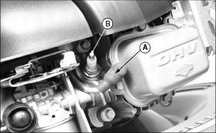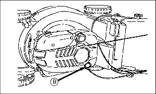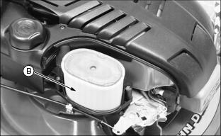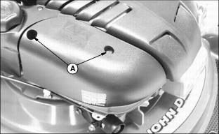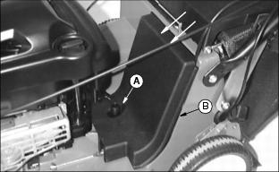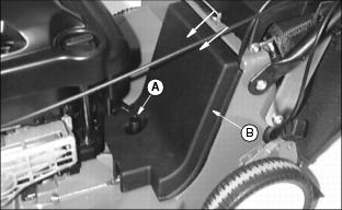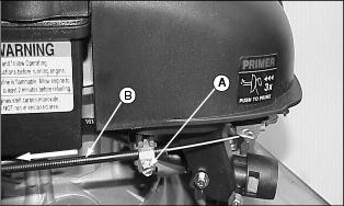 Engine OilUse oil viscosity based on the expected air temperature range during the period between oil changes. The following John Deere oils are preferred: The following John Deere oils are also recommended, based on their specified temperature range: Other oils may be used if above John Deere oil is not available, provided they meet one of the following specifications: ˇ SAE 10W-30-API Service Classification SG or higher ˇ SAE 30-API Service Classification SC or higher Checking Engine Oil Level1. Stop engine. Put mower on level surface. 2. Turn oil dipstick (A) 1/4 turn counterclockwise and remove from the filler tube. 3. Wipe dipstick off with a clean cloth. 5. Remove dipstick. Check oil level. Oil should be between ADD and FULL MARKS shown on dipstick. Not above FULL MARK. 7. Install and tighten dipstick. Changing Engine Oil1. Park mower on a level surface. 2. Drain fuel from tank or run engine until fuel tank is empty or near empty. 3. Stop engine and disconnect spark plug wire. 4. Turn oil dipstick (A) 1/4 turn counterclockwise and remove from the oil filler tube. 5. Insert a plastic drain tube firmly inside oil filler tube opening (B). 6. Place a drain pan on the left side of the mower. 7. Turn mower onto its left side. 8. Allow engine oil to drain from the dipstick filler tube location into the drain pan. 9. After oil has drained, return mower to an upright position. 10. Remove plastic drain tube. Clean area around filler tube. 11. Add 0.47 L (16 oz) oil through dipstick filler tube. 12. Install dipstick. Turn dipstick 1/4 turn clockwise to tighten. 13. Remove dipstick. Check oil level. Add oil to FULL mark if necessary. 14. Install and tighten dipstick. Checking and Cleaning Air Cleaner Element1. Park machine safely. (See Parking Safely in the Safety Section.) 3. Disconnect spark plug wire. 4. Clean dirt and debris from the air cleaner cover. 5. Loosen screws (A), and remove cover. 6. Inspect the foam precleaner (B) without removing it. If the foam precleaner is dirty: a. Remove it from the filter carefully, leaving the paper element in the air cleaner housing. b. Wash precleaner in a solution of warm water and liquid detergent. c. Rinse precleaner thoroughly. Squeeze out excess water in a dry cloth until precleaner is completely dry. 7. Inspect the paper element without removing it. If the paper element is damaged or dirty, remove and replace it with a new element. 8. Clean air cleaner base carefully, preventing any dirt from falling into carburetor. 9. Install foam precleaner onto paper element and install into air cleaner base. 10. Close cover and tighten screws. Do not overtighten. Cleaning and Gapping Spark Plug1. Disconnect spark plug wire (A). Remove spark plug (B). 2. Carefully wire brush carbon from plug. Do not clean it with abrasives in a machine. 3. Inspect plug for damage. Replace damaged plug. 4. Adjust gap: 0.51 mm (0.02 in.). 5. Install and tighten plug to 20 Nˇm (15 lb-ft). Cleaning Engine Cooling Fins1. Clean fins with brush, rag, or compressed air. 2. Blow compressed air under shroud. Adjusting Throttle Cable1. Move throttle lever to fasposition. 2. Loosen screw (A) until cable sheath (B) moves freely. 3. Grasp cable sheath (B) and pull toward rear of machine until cable sheath stops moving. Adjusting Traction Cable (JA62)