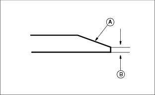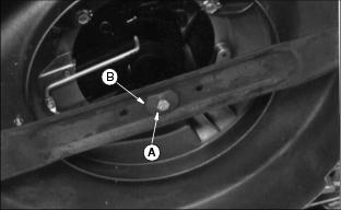 Spray under deck to remove lawn chemicals and grass buildup. Cleaning Belt and Transmission Area (JA62)1. Unscrew and remove knob (A). 2. Apply slight pressure to the top of protective shield (B) to release tabs securing shield to the mower deck. Remove shield. 3. Remove clippings or debris from belt area and top of the transmission using a brush or compressed air. Cleaning Fuel Cap Vents2. Check two vents (A) under metal ring and vent in top, center of cap. 3. Clean cap and vents in nonflammable solvent. Let cap dry. Checking BladeNOTE: Sharpened edges on blade tips must face upward when installing blade. Checking Blade:ˇ Tighten bolt (A) to 75 Nˇm (55 lb-ft). Removing Blade:ˇ Remove bolt (A), washer (B), and blade. NOTE: Make sure blade tip wing points up and washer cup is against blade. Sharpening Bladeˇ Sharpen blade with grinder, hand file or electric blade sharpener ˇ Keep original bevel (A) when you grind. ˇ Blade should have 0.40 mm (1/64 in.) cutting edge (B).