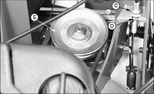 NOTE: Adjust cable if mower slows going uphill. 1. Unscrew and remove knob (A). 2. Apply slight pressure to the top of protective shield (B) to release tabs securing shield to the mower deck. 4. Loosen nut (C). Turn nut (D) down 1/8 in. (3 mm). 7. Engage traction clutch lever to check clutch action. 8. If clutch needs more tension, stop engine and repeat Steps 4 and 5. NOTE: Pulley (E) should not turn when engine is running and clutch lever is disengaged. If pulley turns when engine is running, traction clutch cable is adjusted too tight. GreaseUse grease based on the expected air temperature range during the service interval. The following greases are preferred: ˇ John Deere MOLY HIGH TEMPERATURE EP GREASE ˇ John Deere HIGH TEMPERATURE EP GREASE Other greases may be used if they meet one of the following: ˇ SAE Multipurpose EP Grease with a maximum of 5% molybdenum disulfide. Lubricating Rear Axle Bushings1. Wipe grease fittings clean. 2. Lubricate bushing (A) on each side with John Deere multipurpose grease or an equivalent. Cleaning Mower