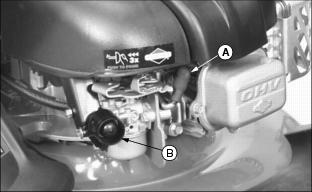 1. Park mower on a level surface and clean area around oil dipstick. 2. Turn oil dipstick (A) 1/4 turn counterclockwise. Remove dipstick. 3. Add 0.47 L (16 oz.) oil through dipstick tube. · Install dipstick, turn it clockwise 1/4 turn and tighten it. · Check oil level: Oil should be between ADD and FULL marks on dipstick. If not, add oil. 5. Install and tighten dipstick. 6. Remove "No Oil" tag from top of engine. Test Mower1. Connect spark plug wire (A) to spark plug. 2. Put enough fuel in fuel tank to test mower operation. 3. Press primer bulb (B) three times to prime engine. 4. Hold blade control lever (C) against handle. 5. Start engine and check mower operation. (See Operating section.) |