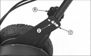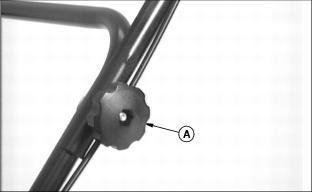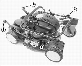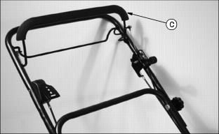 AssemblyUnfold Handles1. Carefully remove mower from shipping carton. 2. Loosen knob (A) approximately 25 mm (1 in.) on each side of upper handle. 3. Remove knob (B) and carriage bolt from each side. 4. Carefully pull folded handle assembly rearward and align the handle hole with the desired height setting hole in bracket (C). 5. Install carriage bolt (D) from the inside through hole in bracket and through handle on each side of handle. Use same hole on each side. NOTE: If handle height is not satisfactory, move handle to another hole and height position. 6. Install and tighten knob (B) on each bolt. Both handle knobs should be positioned on the outside of the handles. 7. Pivot upper portion of handle assembly to a straight and aligning position. Hold handle and tighten knob (A) on each side. Install Starter RopeNOTE: To make installation of starter rope onto rope guide easier, hold blade control lever against handle while pulling starter rope. Pull and install starter rope (A) onto rope guide (B) mounted on the right side of the handle. Add Engine Oil