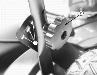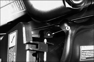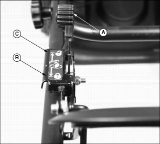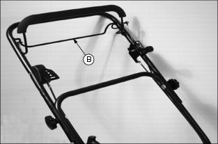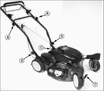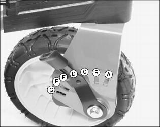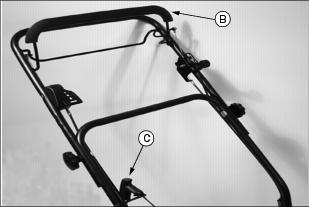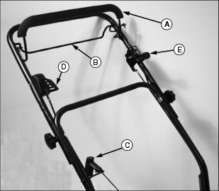 OperatingEngine ControlsHandle ControlsHandle and Cutting Height ControlsLocking Caster WheelsNOTE: Caster wheels will not lock when mower is on an even surface. To lock caster wheels, push mower forward on an uneven surface, such as your yard. Lock caster wheels when cutting on slope, cutting on rough or bumpy ground, or pulling mower backwards away from wall or out of narrow space. To lock caster wheels:1. Push mower forward on an uneven surface. 2. Pull lever (A) backward to lock position (B). To unlock caster wheels:1. Push lever (A) forward to unlock position (C) Adjusting Cutting HeightNOTE: Adjust both levers to same height except for two lowest cutting heights (A and B on following chart). At two lowest cutting heights, raise rear lever one notch higher than front lever. This adjustment allows for increased air flow when bagging and side discharging, and provides a larger exit window for clippings when mulching. Begin at upper cutting height, then adjust downward as desired, to avoid scalping lawn with too low a setting. Highest cutting height for rear wheel is lever in furthest front position. Highest cutting height for front wheel is lever in furthest back position. Adjusting front wheel height:1. Lift front of mower deck slightly with one hand to take some weight off wheels. 2. Move height adjustment lever to desired position with other hand. 3. Repeat for other front wheel. Adjusting rear wheel height:NOTE: One height adjustment lever on left rear wheel adjusts both rear wheels. 1. Lift lower handlebar slightly with one hand to take some weight off wheel. 2. Move height adjustment lever to desired position with other hand. Adjusting Handle HeightNOTE: If you are using a bagger with your mower, bag may prevent lowering of handle. Remove clip (A) to remove rod (B). Remove rod from lower position (C) and insert in upper position as shown to lengthen bag. 1. Remove knob (D) and bolt from handle. 2. Pivot handle to desired height. 3. Install bolt in one of three slots (E) and tighten knob (D) on handle. Testing Safety SystemsUse the following checkout procedure to check for normal operation of machine. If there is a malfunction during one of these procedures, do not operate machine. See your John Deere dealer for service. Perform these tests in a clear open area. Keep bystanders away. Testing Blade/Engine Control Lever2. Release blade/engine control lever. 3. Listen for blade and engine to stop.