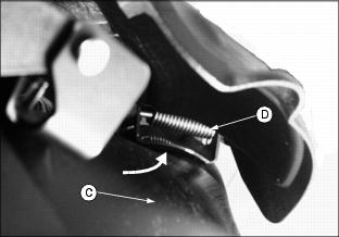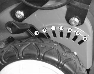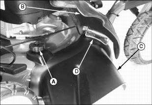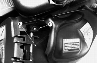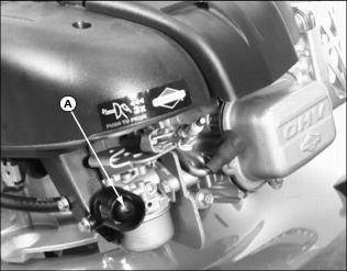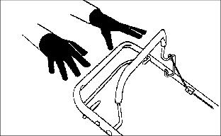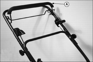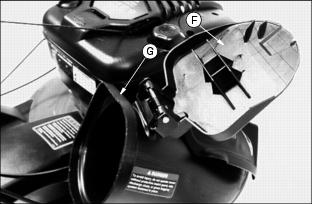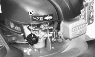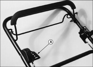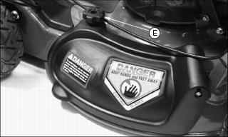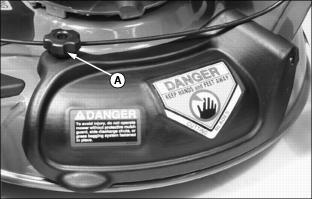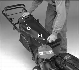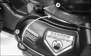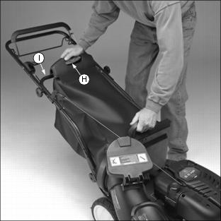 1. Prime engine by pressing primer bulb (A): · Warm Engine - if engine does not start on first or second pull, press primer bulb 1 or 2 times 2. Hold blade control lever (B) against handle. 3. Pull starter handle (C) until you feel resistance. Then pull fast and steady. 4. Return handle slowly when engine starts. Stopping EngineRelease handle and levers:Selecting a Travel SpeedNOTE: It is normal for rear wheels to make a clicking noise when mower is manually pushed. Travel speeds:· 1st Gear: 3.1 km/h (1.9 mph) · 2nd Gear: 3.9 km/h (2.4 mph) · 3rd Gear: 5.0 km/h (3.1 mph) To change travel speeds:NOTE: Mower travel speed can be changed when the traction clutch lever is engaged and the mower is moving forward. · Raise or lower speed control lever (A) to engage desired gear. Operating the Machine1. Hold blade control lever (A) against handle and start engine. · Engine and blade will stop if blade control lever is released. 3. To begin mowing, pull and hold traction clutch lever (B) against handle while continuing to hold blade control lever against handle. 4. To stop forward motion or turn the machine, release lever (B). 5. Release both levers to stop forward motion, as well as the blade and engine. Using Side Discharge Chute2. Remove mulch guard knob (A) from threaded stud. 3. Lift and hold spring loaded mulch guard (B) up. 4. Install side discharge chute (C) under mulch guard spring and mounting bracket (D) and lower onto threaded stud. 6. Install and tighten knob (A) on threaded stud. Installing Grass Bag1. Remove mulch guard knob (A). 2. Lift and hold spring loaded mulch guard (B) up. a. Slide bagging chute (C) into position under the mulch guard mounting bracket (D). b. Lower bagging chute over stud. Install and tighten knob (E). 4. Open spring loaded bagging chute safety door (F). 5. Hang grass bag over bagging chute lip (G). 6. Hang upper grass bag (H) on mower handle (I). Removing and Emptying Grass BagNOTE: Bag may wear and deteriorate. Check condition of bag often. Use a John Deere bag or equivalent to comply with safety specifications. 1. Release blade control lever to stop engine. 2. Grasp handle (A) and handle (B) from left side of mower. Lift bag off mower. 3. Lower front of bag and raise rear of bag. Shake bag to empty contents. |