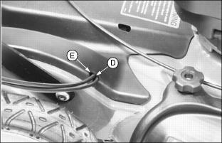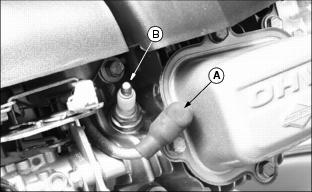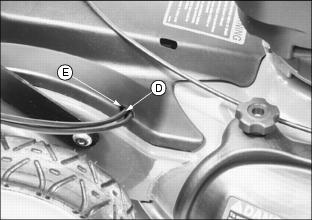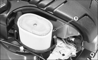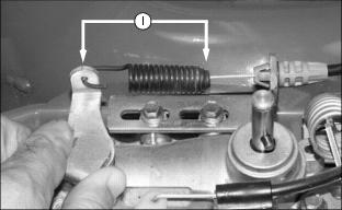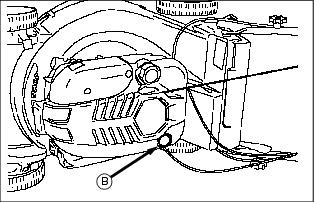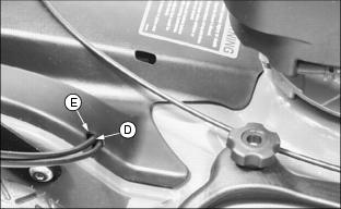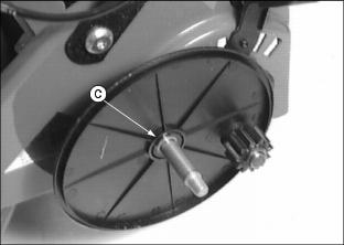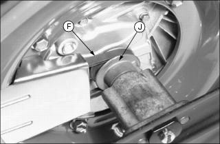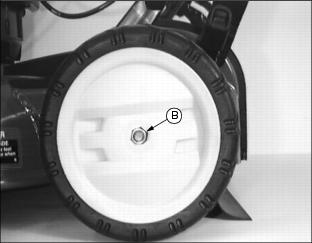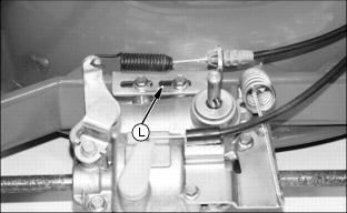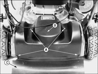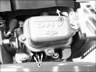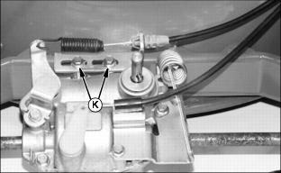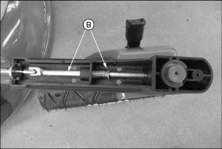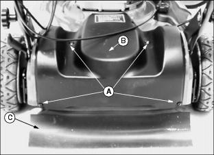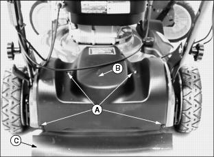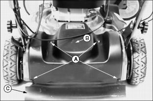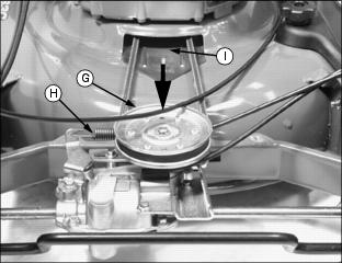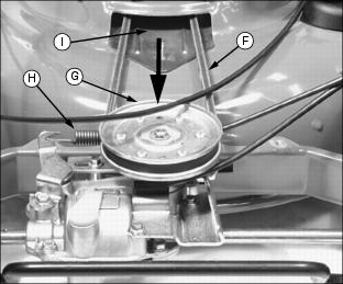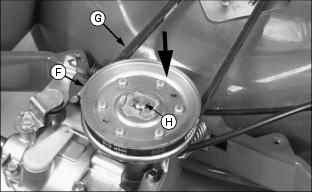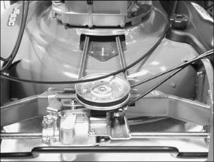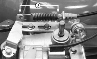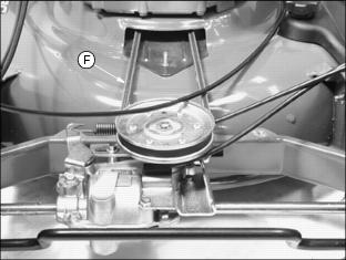 ServiceEngine Warranty Maintenance StatementMaintenance, repair, or replacement of the emission control devices and systems on this engine, which are being done at the customers expense, may be performed by any nonroad engine repair establishment or individual. Warranty repairs must be performed by an authorized John Deere dealer. Adjusting CarburetorNOTE: Carburetor is calibrated by the engine manufacturer and should not require any adjustments. NOTE: If engine is operated at altitudes above 1829 m (6,000 ft.), some carburetors may require a special high altitude main jet. See your John Deere dealer. If engine is hard to start or runs rough, check the TROUBLESHOOTING section of this manual. After performing the checks in the troubleshooting section and your engine is still not performing correctly, contact your John Deere dealer. Avoid FumesEngine OilUse oil viscosity based on the expected air temperature range during the period between oil changes. The following John Deere oils are preferred:The following John Deere oils are also recommended, based on their specified temperature range:Other oils may be used if above John Deere oil is not available, provided they meet one of the following specifications:· SAE 10W-30-API Service Classification SG or higher · SAE 30-API Service Classification SC or higher Checking Engine Oil Level1. Park mower on level surface and stop engine. 2. Turn oil dipstick (A) 1/4 turn counterclockwise. Remove dipstick and wipe with clean cloth. 3. Install dipstick. Turn dipstick 1/4 turn clockwise and tighten. 4. Remove dipstick. Check oil level. Oil should be between ADD and FULL marks shown on dipstick, not above FULL mark. 6. Install and tighten dipstick. Changing Engine Oil1. Park mower on level surface. 2. Drain fuel from tank or run engine until fuel tank is empty or near empty. 3. Stop engine and disconnect spark plug wire. 4. Turn oil dipstick (A) 1/4 turn counterclockwise and remove from the oil filler tube. 5. Insert plastic drain tube supplied with mower firmly inside oil filler tube opening (B). 6. Place a drain pan on the left side of the mower. 7. Turn mower onto its left side. 8. Allow engine oil to drain from dipstick filler tube location into drain pan. 9. After oil has drained, return mower to upright position. 10. Remove plastic drain tube. Clean area around filler tube. 11. Add 0.47 L (16 oz) oil through dipstick filler tube. 12. Install dipstick. Turn dipstick 1/4 turn clockwise to tighten. 13. Remove dipstick. Check oil level. Add oil to FULL mark if necessary. 14. Install and tighten dipstick. Checking and Cleaning Air Cleaner Element1. Park mower on level surface and stop engine. 3. Disconnect spark plug wire. 4. Clean dirt and debris from air cleaner cover. 5. Loosen screws (A), and remove cover. 6. Inspect foam pre-cleaner (B) without removing it. If foam pre-cleaner is dirty: a. Remove it from filter carefully, leaving paper element in air cleaner housing. b. Wash pre-cleaner in solution of warm water and liquid detergent. c. Rinse pre-cleaner thoroughly. Squeeze out excess water in dry cloth until pre-cleaner is completely dry. 7. Inspect paper element without removing it. If paper element is damaged or dirty, remove and replace it with new element. 8. Clean air cleaner base carefully, preventing any dirt from falling into carburetor. 9. Install foam pre-cleaner onto paper element and install into air cleaner base. 10. Close cover and tighten screws. Do not overtighten. Cleaning and Gapping Spark Plug1. Park mower on level surface and stop engine. 2. Disconnect spark plug wire (A). Remove spark plug (B). 3. Carefully wire brush carbon from plug. Do not clean it with abrasives in a machine. 4. Inspect plug for damage. Replace damaged plug. 5. Adjust gap: 0.51 mm (0.02 in.). 6. Install and tighten plug to 20 N·m (15 lb-ft). Cleaning Engine Cooling Fins1. Park mower on level surface and stop engine. 3. Clean fins (A) and under cover (B) with brush, rag, or compressed air. Cleaning Drive Belt and Transmission Area1. Park mower on level surface and stop engine. 2. Disconnect spark plug wire. 3. Remove screws (A), belt shield (B), and drag flap (C). 4. Remove control cables (D) from belt shield notch (E). Picture Note: Belt area and top of transmission 5. Remove grass clippings from belt area and top of transmission. 6. Slide control cables into belt shield notch. 7. Install drag flap and belt shield with screws. Checking and Replacing Drive Belt1. Park mower on level surface and stop engine. 2. Disconnect spark plug wire. 3. Remove screws (A), belt shield (B), and drag flap (C). 4. Remove control cables (D) from belt shield notch (E). 5. Inspect belt (F) for excessive wear or damage. To Replace Drive Belt:1. Push down on front of drive sheave (G) to relieve spring tension on belt (F) and remove drive belt. NOTE: Tension spring (H) may come loose when drive belt is removed. Install after you replace belt. 2. Move belt through deck opening (I) into underside of mower deck. 3. Turn mower on its left side. 4. Remove drive belt (F) from blade sheave (J) and mower blade. 5. Install new drive belt over mower blade and onto blade sheave. 6. Insert belt back through deck opening (I). 7. Return mower to upright position. 8. Install tension spring (H) if removed. 9. Push down on front of drive sheave (G) and install belt on sheave. 10. Slide control cables into belt shield notch. 11. Install drag flap and belt shield with screws. Adjusting Transmission Cable1. Park mower on level surface and stop engine. 2. Disconnect spark plug wire. 3. Remove screws (A), belt shield (B), and drag flap (C). 4. Remove control cables (D) from belt shield notch (E). 5. Push down on front of drive sheave (F) to relieve spring tension on belt and remove drive belt (G). 6. Remove E-clip (H) and drive sheave. 7. Measure the clutch spring length (I) in the relaxed position. Record this value. 8. Engage the traction clutch lever (at handle bar) and measure the spring lengt