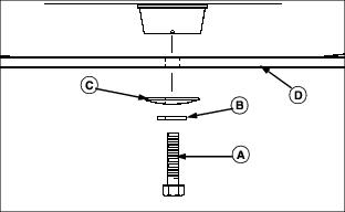 1. Park machine safely. (See Parking Safely in the Safety Section.) 2. Place mower deck in lowest setting. 4. Measure distance from bracket (A) to washer (B) on tension rod (C). · Distance (D) should be: 20 - 25 mm (0.78 - 0.98 in). 5. Continue with the following steps, if adjustment is required. 7. Remove spring locking pin and washer (E) and disconnect tension rod from blade drive arm. 9. Turn fitting on tension rod clockwise to shorten and counterclockwise to lengthen effective rod length. 10. Tighten lock nut (F) to 27 N·m (20 lb-ft.). 11. Assemble tension rod and recheck dimension (D). 12. Check spindle brake clearance. Adjusting Spindle Brake1. Park machine safely. (See Parking Safely in the Safety Section.) 2. Place mower deck in lowest setting. 4. Check mower belt tension and adjust, if necessary.