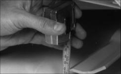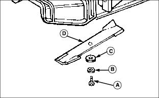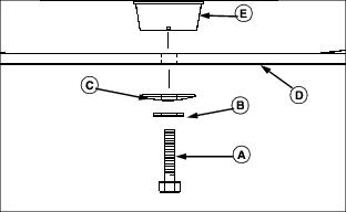 6. Measure distance from brake surface (A) to pulley braking surface (B). Brake to Pulley Distance should be: 2 - 3 mm (0.08 - 0.12 in). 7. If adjustment is required, turn nut (C) on end of brake rod (D) in correct direction to set brake at proper distance from pulley. Checking for Bent Mower Blades1. Park machine safely. (See Parking Safely in the Safety Section). 2. Put lift lever in mowing position. 3. Measure distance between blade tip and flat ground surface. 4. Turn blade. Measure distance between other blade tip and flat ground surface. 5. Install new blade, if the difference between the two measurements is more than 3 mm (1/8 in). Servicing Mower Blades (38 and 46-Inch Decks)Removing Mower Blades1. Raise mower deck to gain access to mower blades. If necessary, remove mower deck. 2. Block mower blade with a piece of wood to prevent it from spinning. 3. Loosen and remove cap screw (A), hardened washer (B), cupped blade washer (C) and blade (D). 4. Inspect blades; sharpen, balance or replace blades as necessary. Installing Mower Blades1. Lubricate cap screw threads lightly with a general purpose grease or oil. This lubrication is to prevent rusting and seizing. 2. Position mower blade (D) with the cutting edge towards the ground onto the mower spindle. 3. Install cupped blade washer (C) with cup side toward the blade. 4. Install hardened washer (B). 5. Install and hand tighten cap screw (A) until mower blade is in full contact (fully seated) with spindle. 6. Block mower blade with a piece of wood to prevent spinning and tighten cap screws to 56 N·m (41 lb-ft). Servicing Mower Blades (42-Inch Deck)Removing Mower Blades1. Raise mower deck to gain access to mower blades. If necessary, remove mower deck. 2. Block mower blade with a piece of wood to prevent it from spinning. NOTE: Before removing hardware, note the orientation of the cupped blade washer (C) to ensure proper installation. 3. Loosen and remove cap screw (A), hardened washer (B), cupped blade washer (C), blade (D) and deflector cup (E). 4. Inspect blades; sharpen, balance or replace blades as necessary. Installing Mower Blades1. Lubricate cap screw threads lightly with a general purpose grease or oil. This lubrication is to prevent rusting and seizing. 2. Install deflector cup (E) on spindle. 3. Position mower blade (D) with the cutting edge towards the ground onto the mower spindle. 4. Install cupped blade washer (C) with cup side toward the blade. 5. Install hardened washer (B). 6. Install and hand tighten cap screw (A) until mower blade is in full contact (fully seated) with spindle. 7. Block mower blade with a piece of wood to prevent spinning and tighten cap screws to 56 N·m (41 lb-ft). Sharpening BladesSharpen blades with grinder, hand file, or electric blade sharpener. Keep original bevel (A) when grinding. Blade should have 0.40 mm (1/64 in.) cutting edge (B) or less. Balance blades before installing. Balancing Blades2. Put blade on nail in a vise. Turn blade to horizontal position. 3. Check balance. If blade is not balanced, heavy end of blade will drop. |