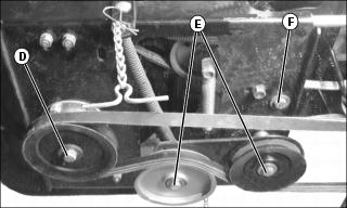 3. Lubricate pulley shaft (D) and idler shafts (E) with light machine oil.