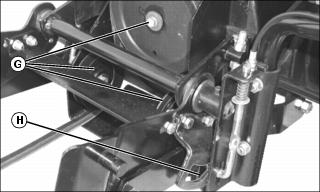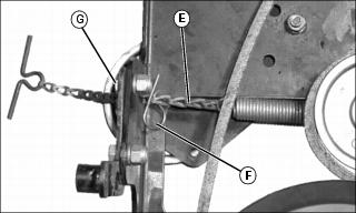 6. Electric PTO tractor only: Pull chain (E) until spring locking pin (F) hits inside of clutch idler assembly frame. Install spring locking pin (G) on outside of clutch idler assembly frame.