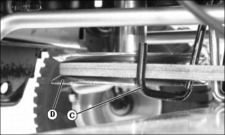 5. Route upper V-belt through belt guides (C) and around tractor pulley (D) as shown.