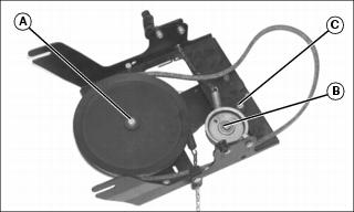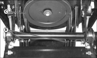 3. Install new V-belt under two idler pulleys (B) and roll it around jack shaft pulley (C) on snow blower assembly.