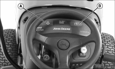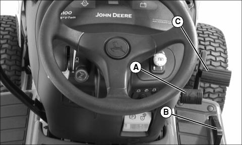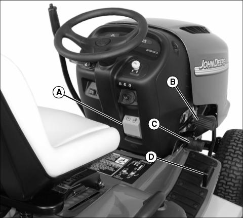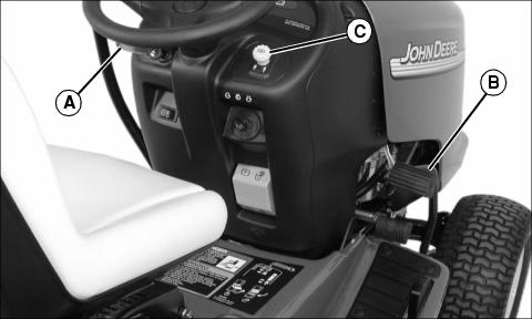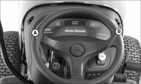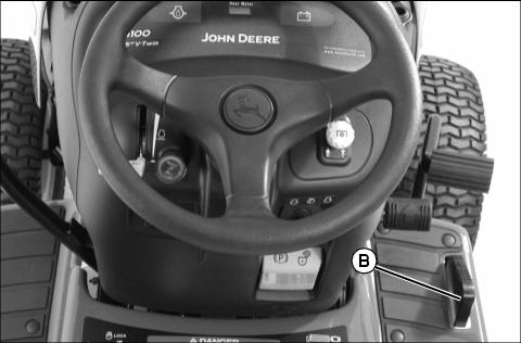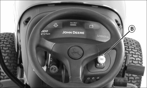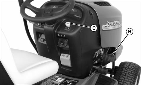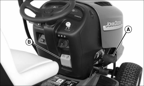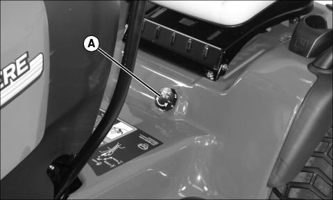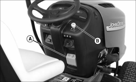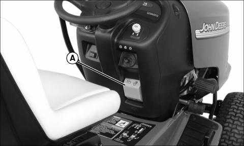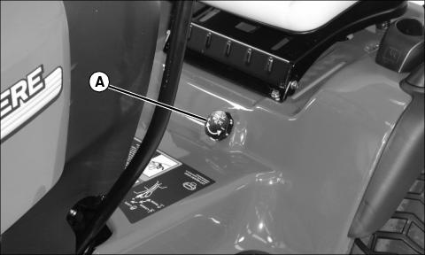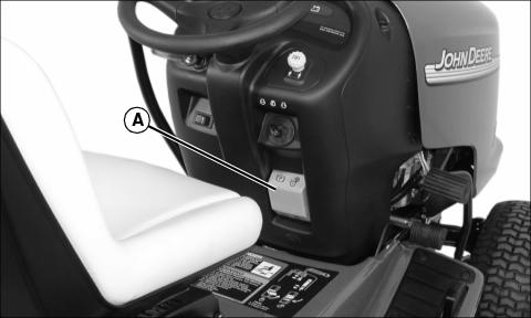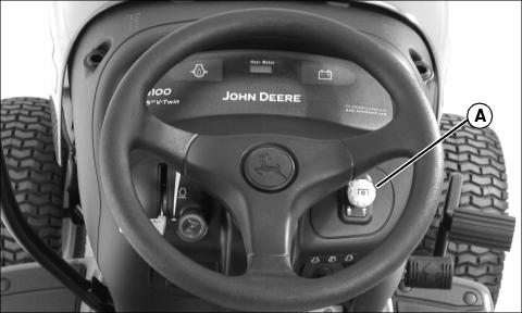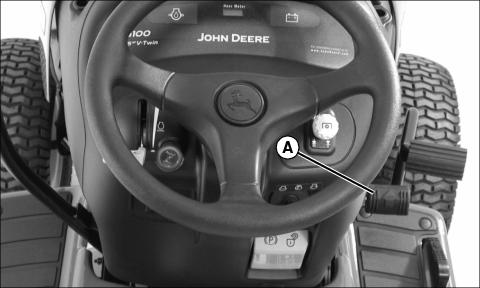 3. Lift and hold PTO knob (A) up past PTO engagement position to activate reverse implement position while depressing reverse foot pedal slightly.