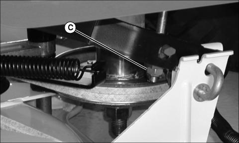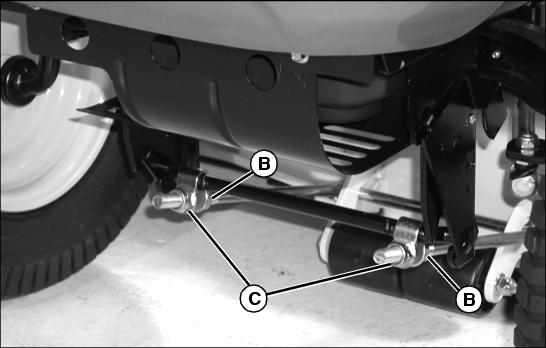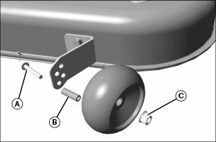 4. Check mower wheel position. Remove bolt (A), bushing (B), and nut (C) and move mower wheels to proper hole.