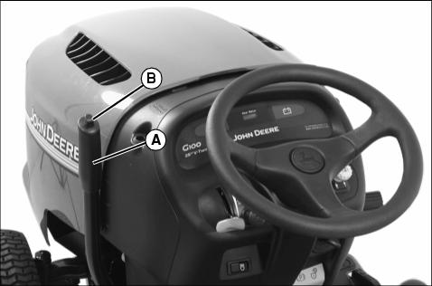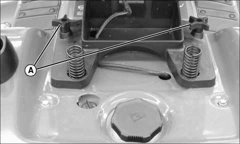 1. Tip seat forward and loosen two knobs (A) to slide seat assembly forward or rearward to most comfortable operator position.