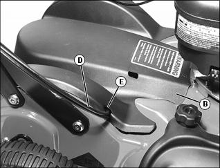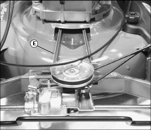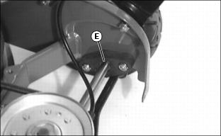 4. Remove control cables (D) from belt shield notch (E), and remove belt shield (B).