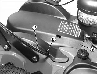 4. Slide control cables (C) into belt shield notch (D).