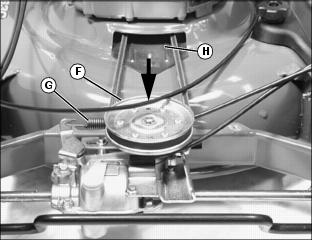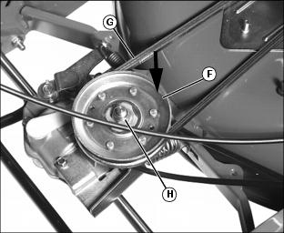5. Push down on front of drive sheave (F) to relieve spring tension on belt and remove drive belt (G).