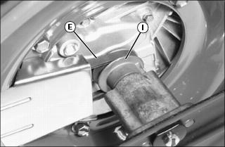3. Tilt mower slightly to one side. Lubricate driveshaft hub bushing (E) with a few drops of light weight motor oil. Repeat procedure for other side.
