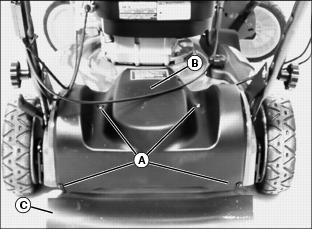 3. Remove screws (A) from belt shield (B) and drag flap (C). Remove drag flap.