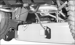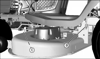 · If necessary, turn the front draft arm nut (C) counterclockwise so the front edge of the deck is 3-6 mm (1/8-1/4 in.) lower than the rear corners of the deck.