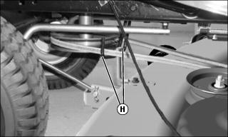 6. Remove spring locking pin and washer (H) and front draft rod (I) from mower deck bracket (J).