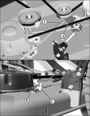 a. Route cable under mower belt and brake rod and attach cable spring (I) to idler sheave bracket (J).