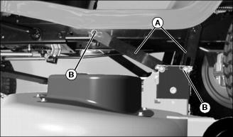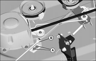 2. Loosen nuts (A) and move cable bracket (B) away from the center of deck to tighten belt tension. Tighten nuts.