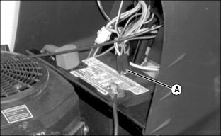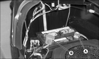 3. Push red cover (B) away from positive (+) battery terminal and remove cable from battery.
