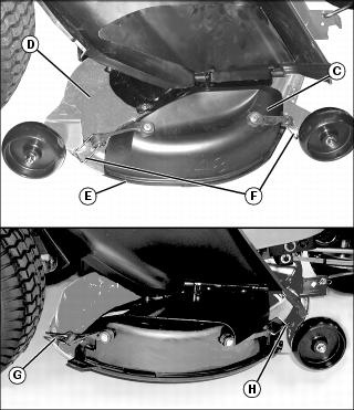 · On 107 cm (42 in.) deck, slot (G) on left side and wheel bracket hole (H).