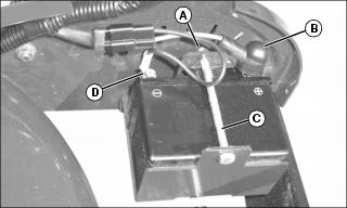 d. Remove nut (A) and bolt (C) and remove battery.
