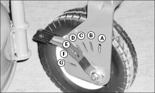 2. Set all wheels at the same cutting height. The highest cutting height is location G. The lowest cutting height is location A.