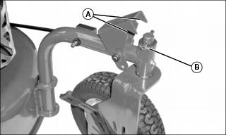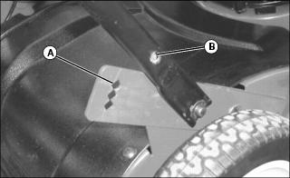 1. Push mower straight forward to align caster wheel and stud pin (B) with notches (A) in locking clip on left caster wheel.