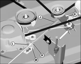 a. Route cable under mower belt and brake rod and attach cable spring (J) to idler sheave bracket (K).