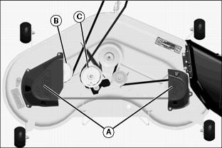 6. Install belt on mower deck as shown. Make sure belt is in the groove of each sheave and inside belt guides (C).