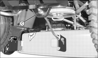 • If the front of the mower deck is not lightly touching the front block, adjust the front draft arm by turning the nut (C).