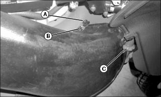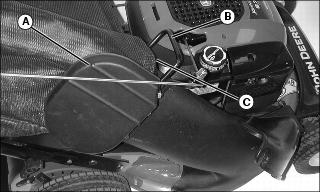 6. Install slot (C) on inside rear of deflector onto stud behind rear of discharge opening, where rear of recycling cover was originally secured.