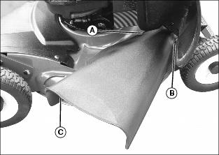 1. Open adapter door (A) and slide grass bag connector (B) over adapter flange (C).
