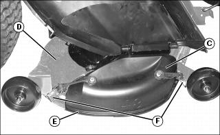 • If the front of the mower deck is not lightly touching the front block, adjust the front draft arm by turning the nut (C).