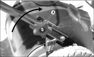 2. Remove knobs (A), lock washers and carriage bolts that secure handles to mower.